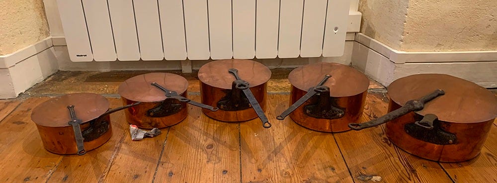 In the almost twenty years leading up to late 2019, antique French copper and glassware were merely things we collected for ourselves on our many, many trips to the Paris flea market in St. Ouen. Over time, all that casual antique collecting — a sauté pan here, a gratin there — lead to an interest in making French food, which lead to hosting what would become a weekly dinner for various friends at our home in upstate New York. Over those lovely meals, served with a flourish in copper pans, antique porcelain dishes and fin-de-siecle glassware, many of our guests caught the French cookware bug too, and asked us to look out for a specific piece or two on our next trip.