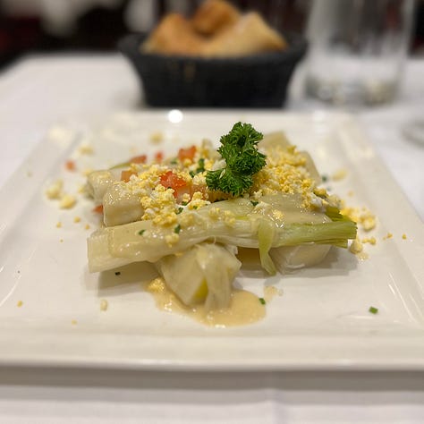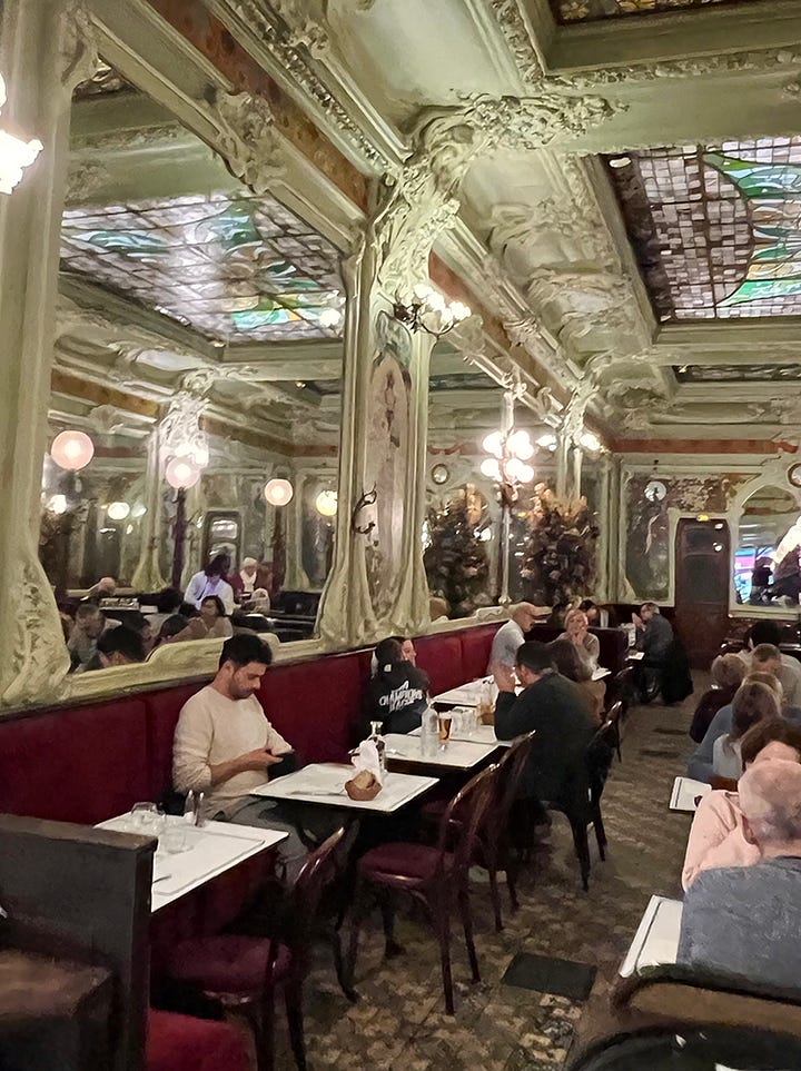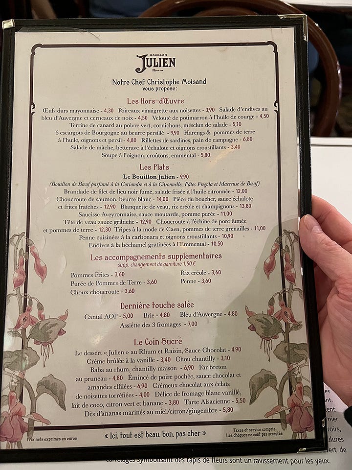 My favorite! Created in 1904 in a former 19th century patisserie, Vagenende (formerly Le Bouillon Chartier Odéon) offers the most sophisticated range of menu options. It’s decidedly upscale, but maintains the bouillon vibe, and is moderately priced. I highly recommend dining here …. more than once if possible! While there, four Parisians at the table next to me were going all out: Champagne, Oysters and Bone Marrow for starters. Then Sweetbreads, Sole Menuière, Duck … it went on and on (check out their fabulous menu here). That’s the vibe at Vagnende: celebratory! I had the Braised Leeks (9.5€, divinely subtle), Steak Tartare (24.5€), and finished with Vagenede’s house made Chocolate Mousse (13€).