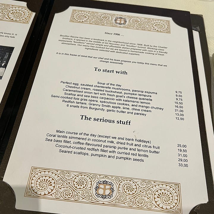 This is such a well-curated exploration of Parisian dining history. What stands out is how you matched each bouillon's personality to the experience, rather than just listing dishes. The detail about the original menu card system being inspired by department store efficiency is fascinatng, it shows how social dining shifted from elite salons to accessible public spaces. I've always wanted to try Vagenende after hearing the buzz, andyour oyster table neighbors sealed the deal.