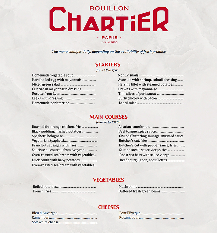 Getting there: 59 Boulevard de Montparnasse. (6th). Metro line 4 to Montparnasse-Bienvenüe. Web: bouillon-chartier.com